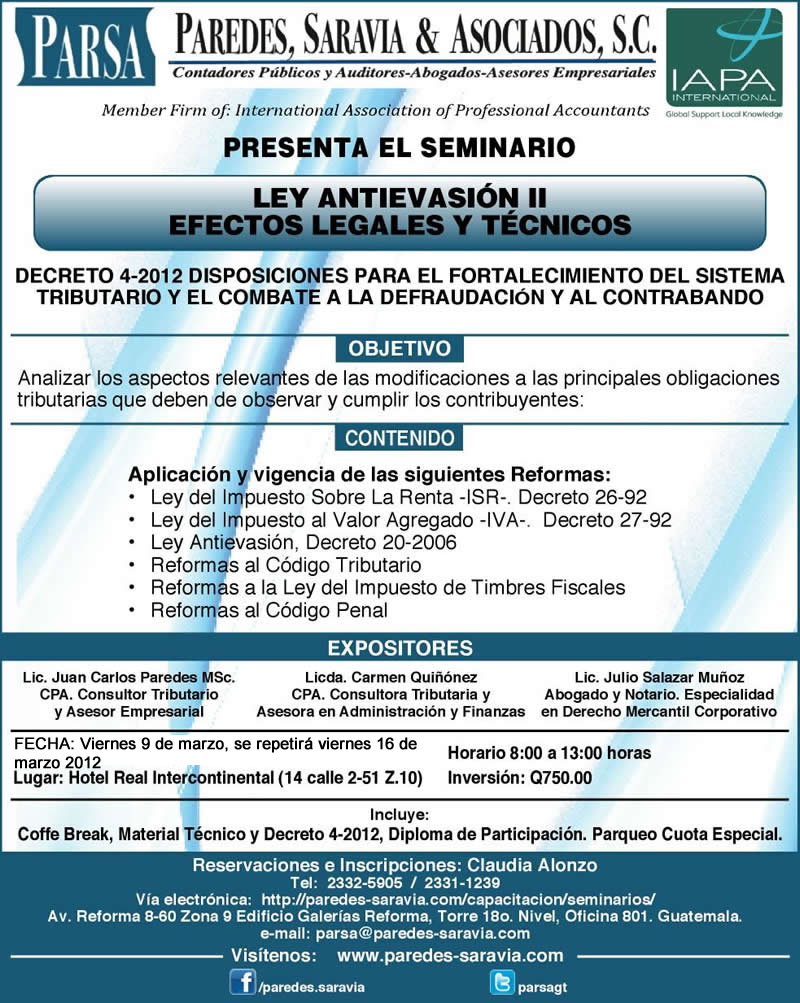 En esta ocasión los saludamos cordialmente deseándole éxitos en sus actividades y al mismo tiempo extenderle la invitación a nuestro próximo seminario "Ley Antievasión II: Efectos Legales y Técnicos" a realizarse el viernes 9 y se repetirá el viernes 16 de marzo de 2012. División de Capacitación y Desarrollo Empresarial |