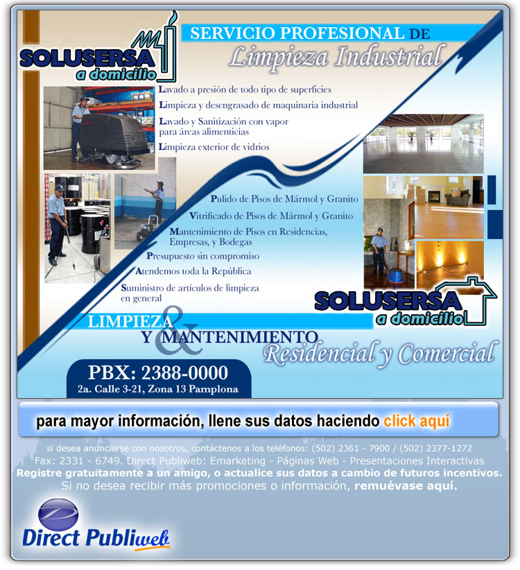 "Servicio Profesional de Limpieza Industrial, Residencial y Comercial" PBX 2388-0000 / solusersa@grupomisol.com
